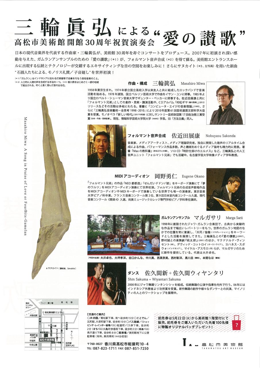 こちらは高松市美術館の30周年を記念し、作曲家の三輪眞弘さんのプロデュースによって開催されるコンサートで、私たちは三輪さんのガムラン曲「愛の讃歌」を演奏します。